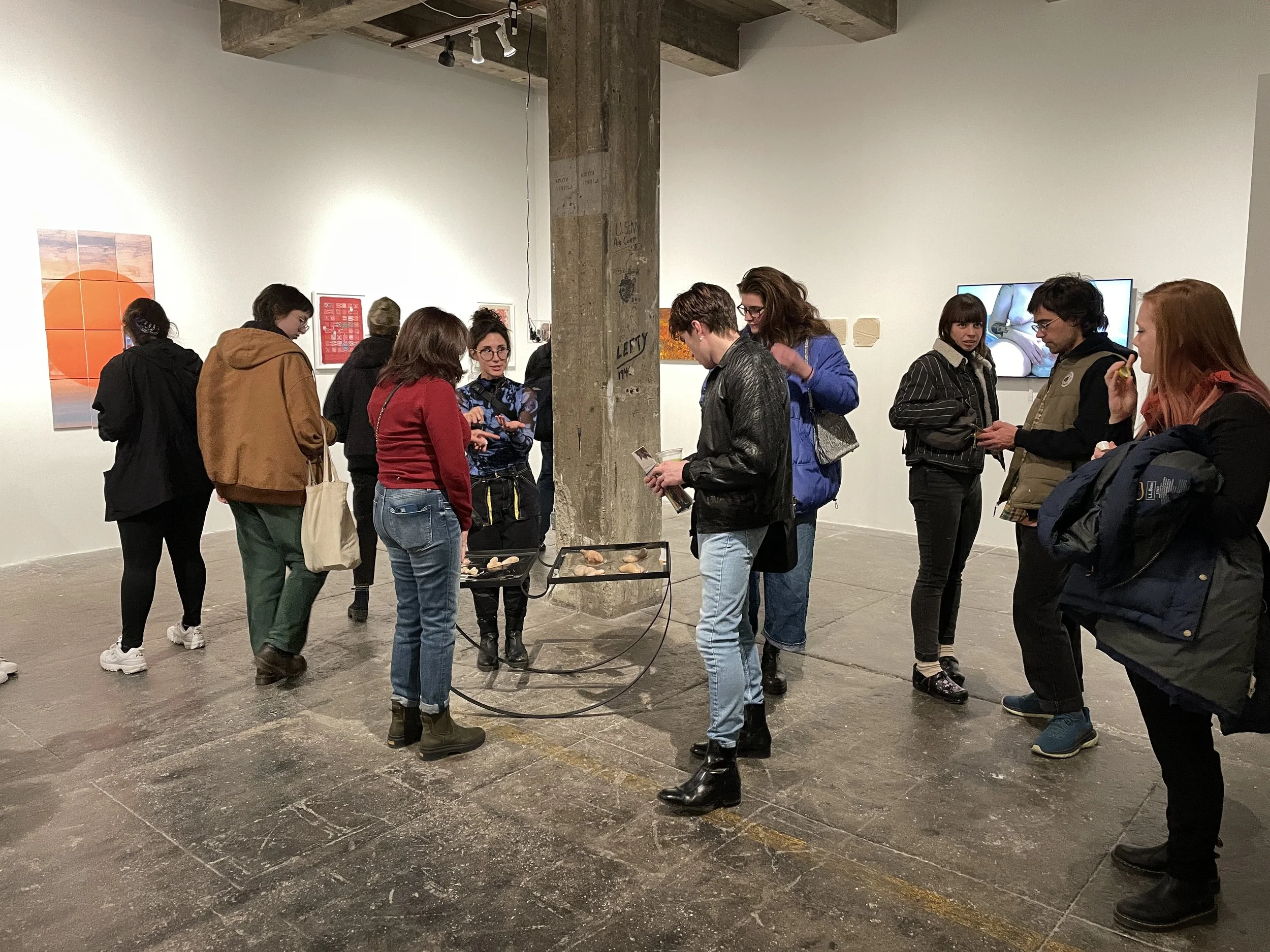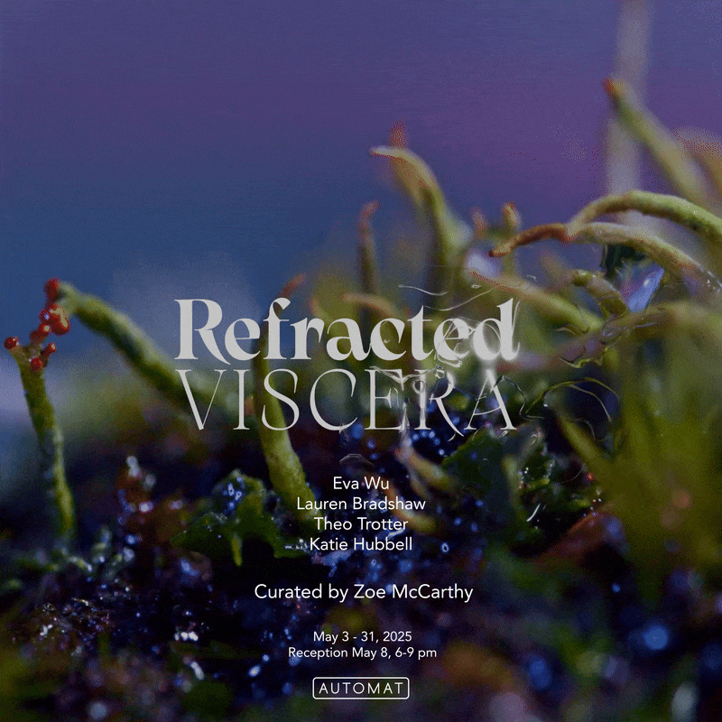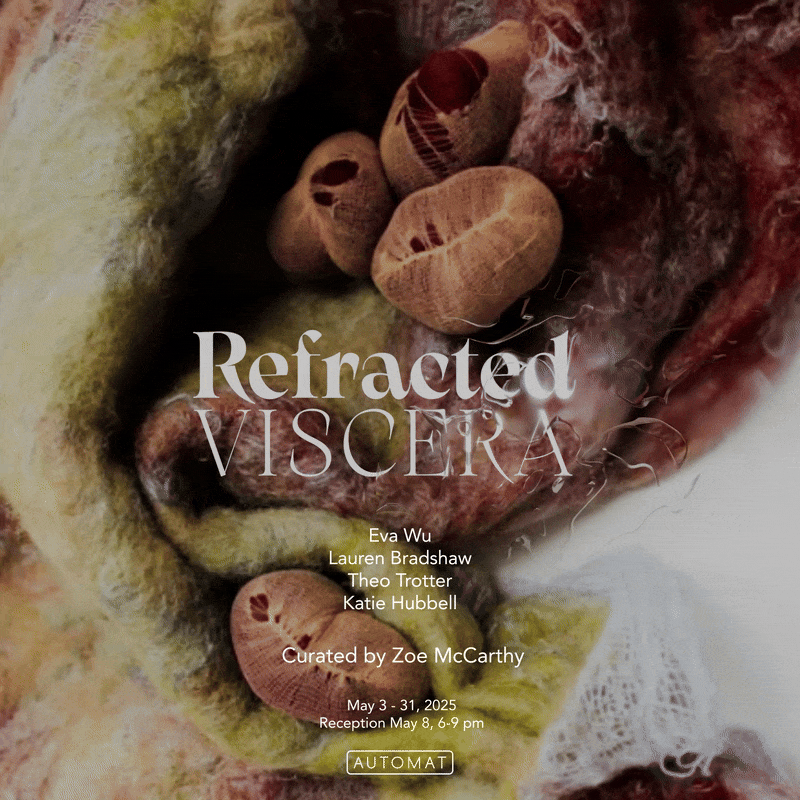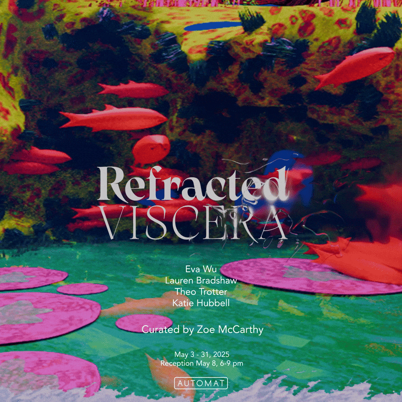 Exhibited in May 2025, Refracted Viscera is a cross-disciplinary, immersive exhibition featuring the works of Eva Wu, Lauren Bradshaw, Theo Trotter, and Katie Hubbell, exploring the queer and femme sensual imagination through the lens of embodiment, materiality, and digital experimentation. Centering the question of how femme and queer bodies are depicted in a media landscape that rarely represents them authentically, Refracted Viscera offers a multisensory space where organic, abstract, and evocative visions of bodies emerge. Utilizing mediums such as Virtual Reality, animation, and sculpture, the artists create visceral, speculative worlds that resist the exploitative frameworks of mainstream sexual media. Femme and queer experiences, like a prism, are multifaceted, and this installation explores what is refracted within that prism.